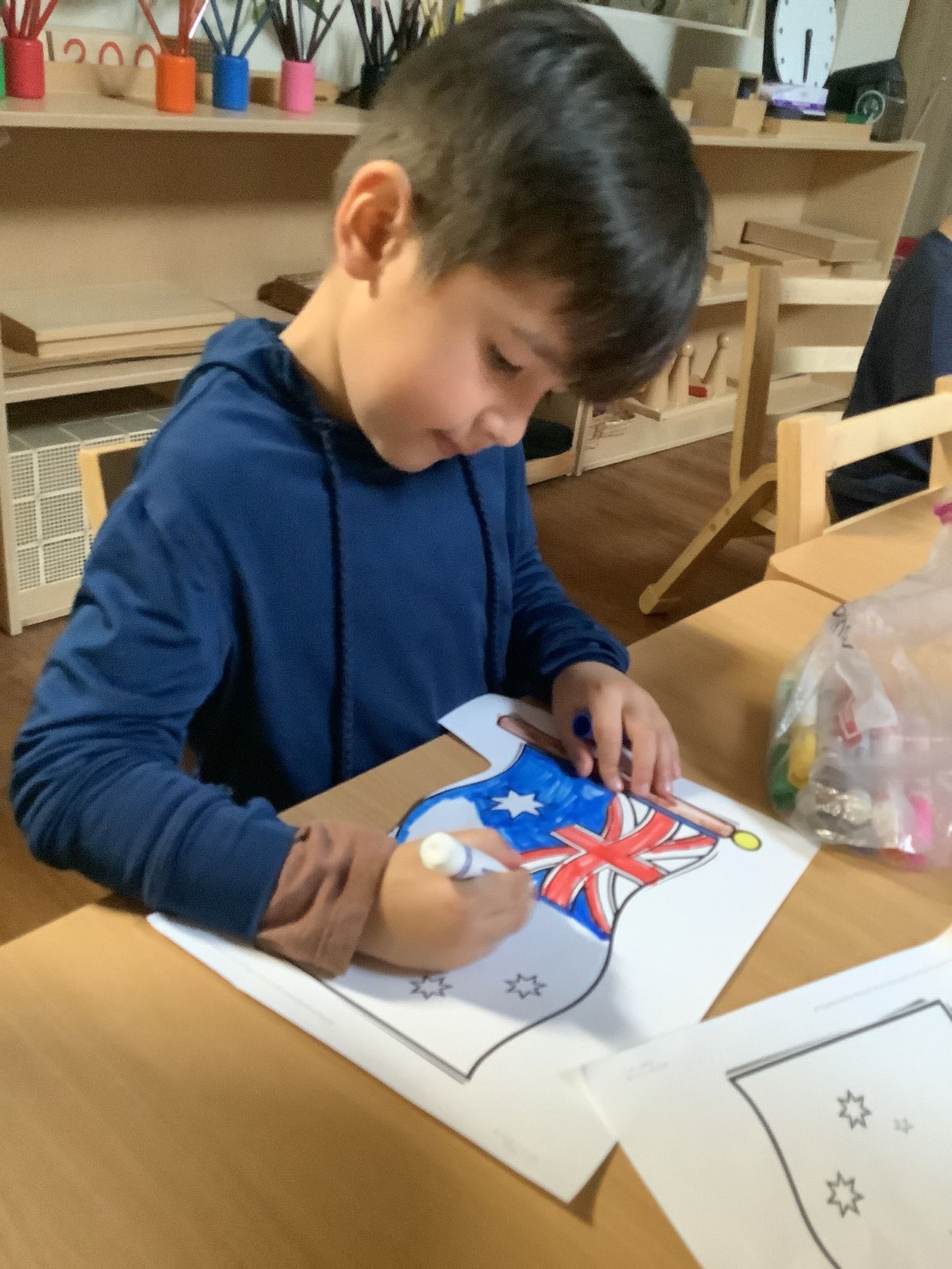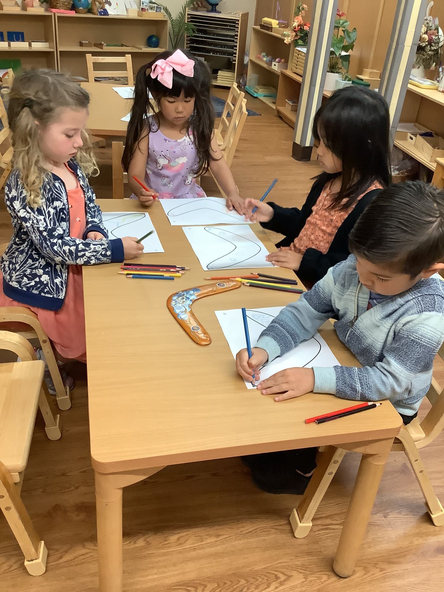 Children were exposed to various landforms, animals, and plants typical of the country, which we also studied for our Zoology and Botany lessons. We learned about the Great Barrier Reef and that it is the most extensive coral reef in the world, with more than 1,500 fish species! Because it is a remote island, Australia has many animals and plants that cannot be found anywhere else. They have some cool and unusual animals the children learned about, like kangaroos, koalas, and kookaburra. Children studied the insects and were amazed that they have super speedy dragonflies in Australia. Learning about insects was a great way to incorporate the life sciences into their study, and many cool facts about them were learned. We learned about the Australian boomerang initially used by the Aborigines, the first people who lived in Australia for hunting. We learned about their art forms.