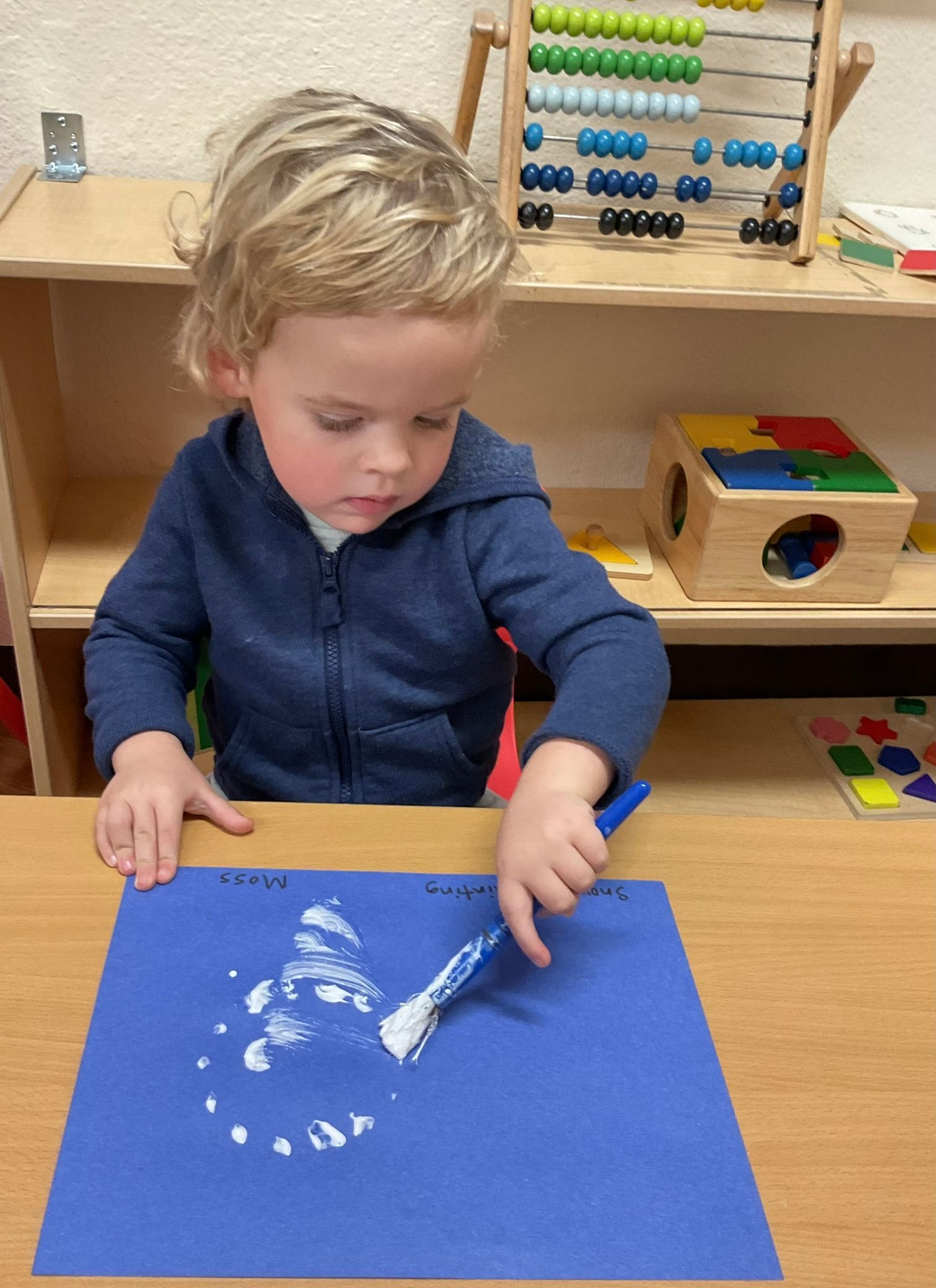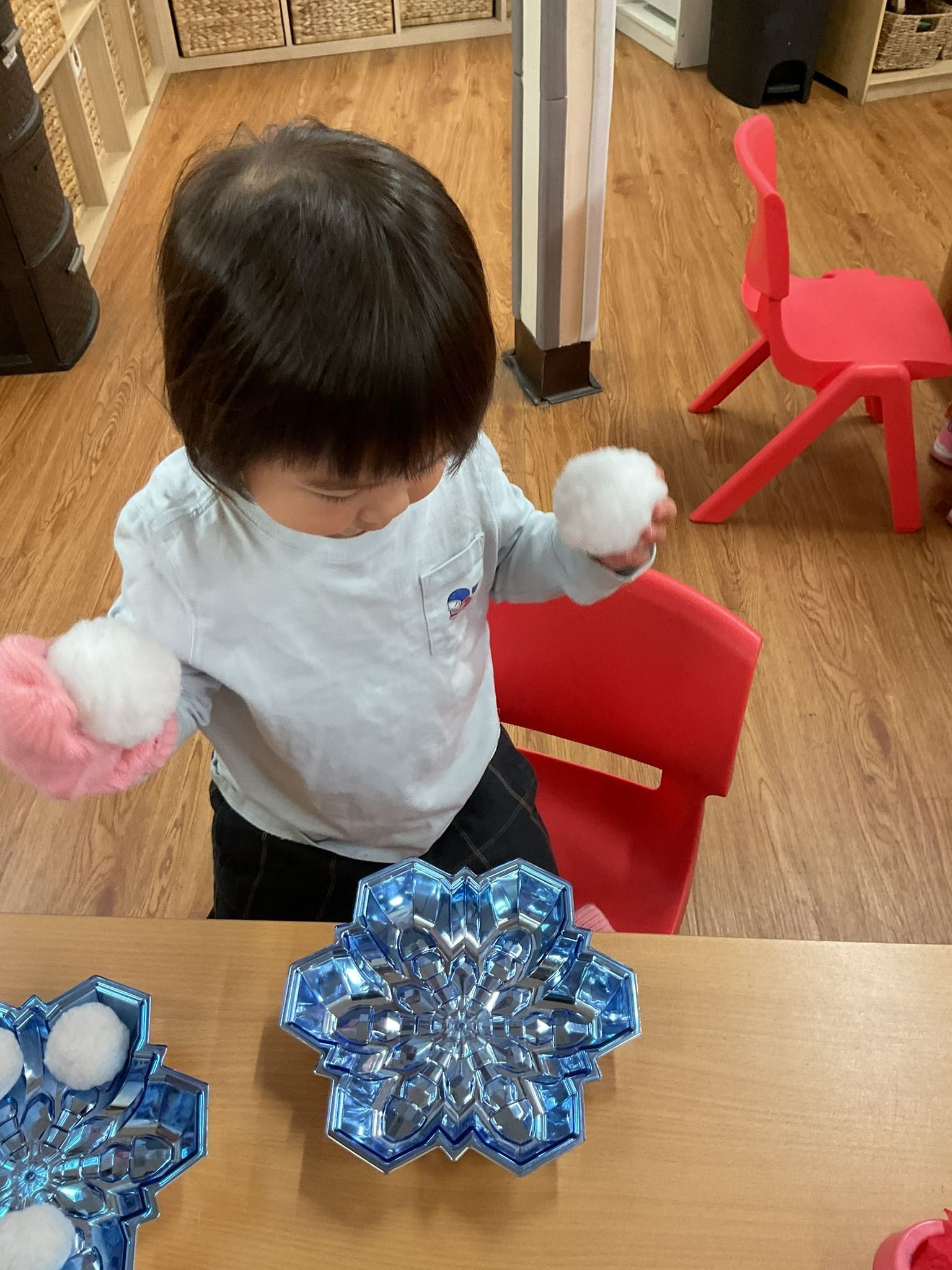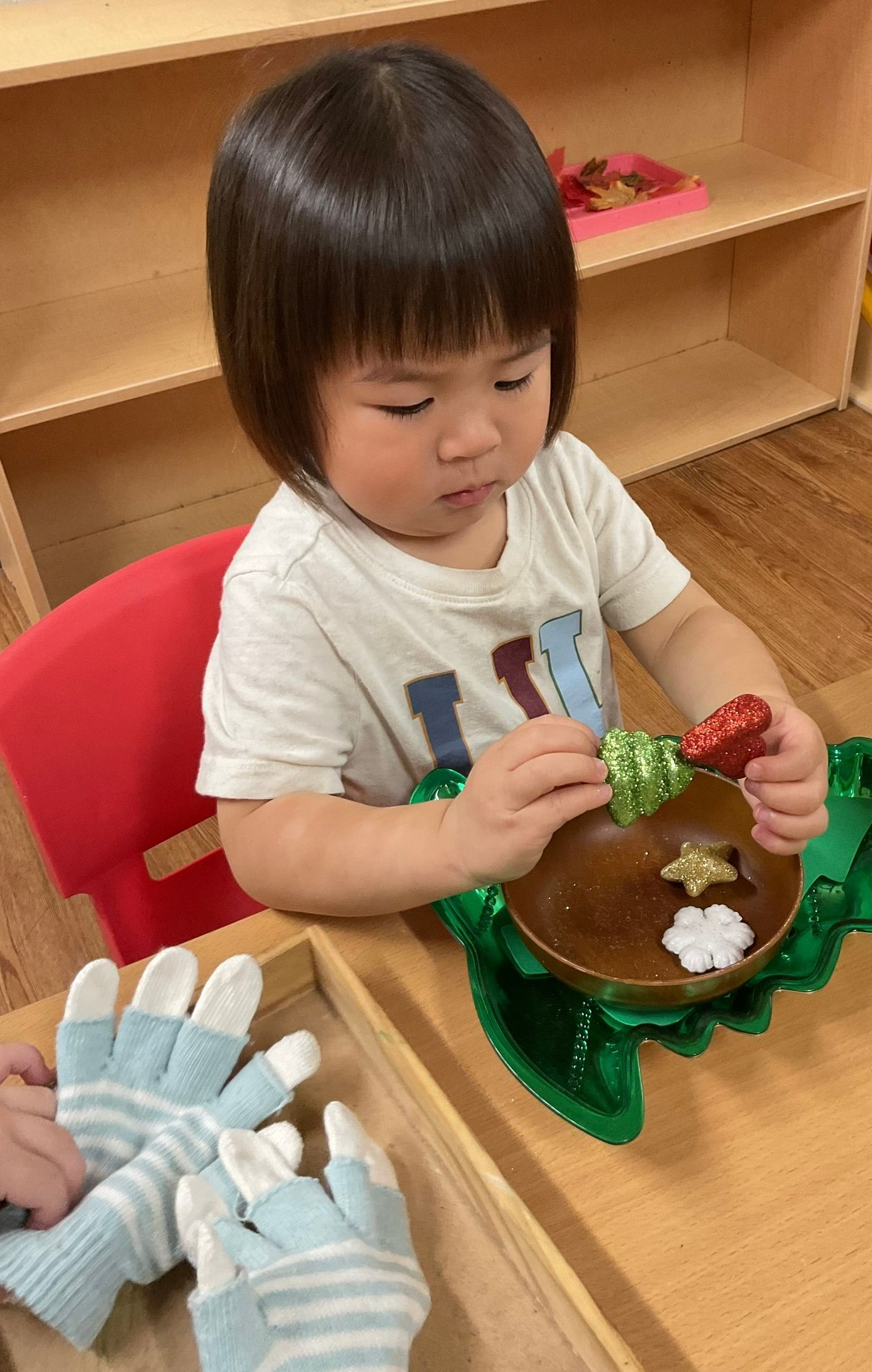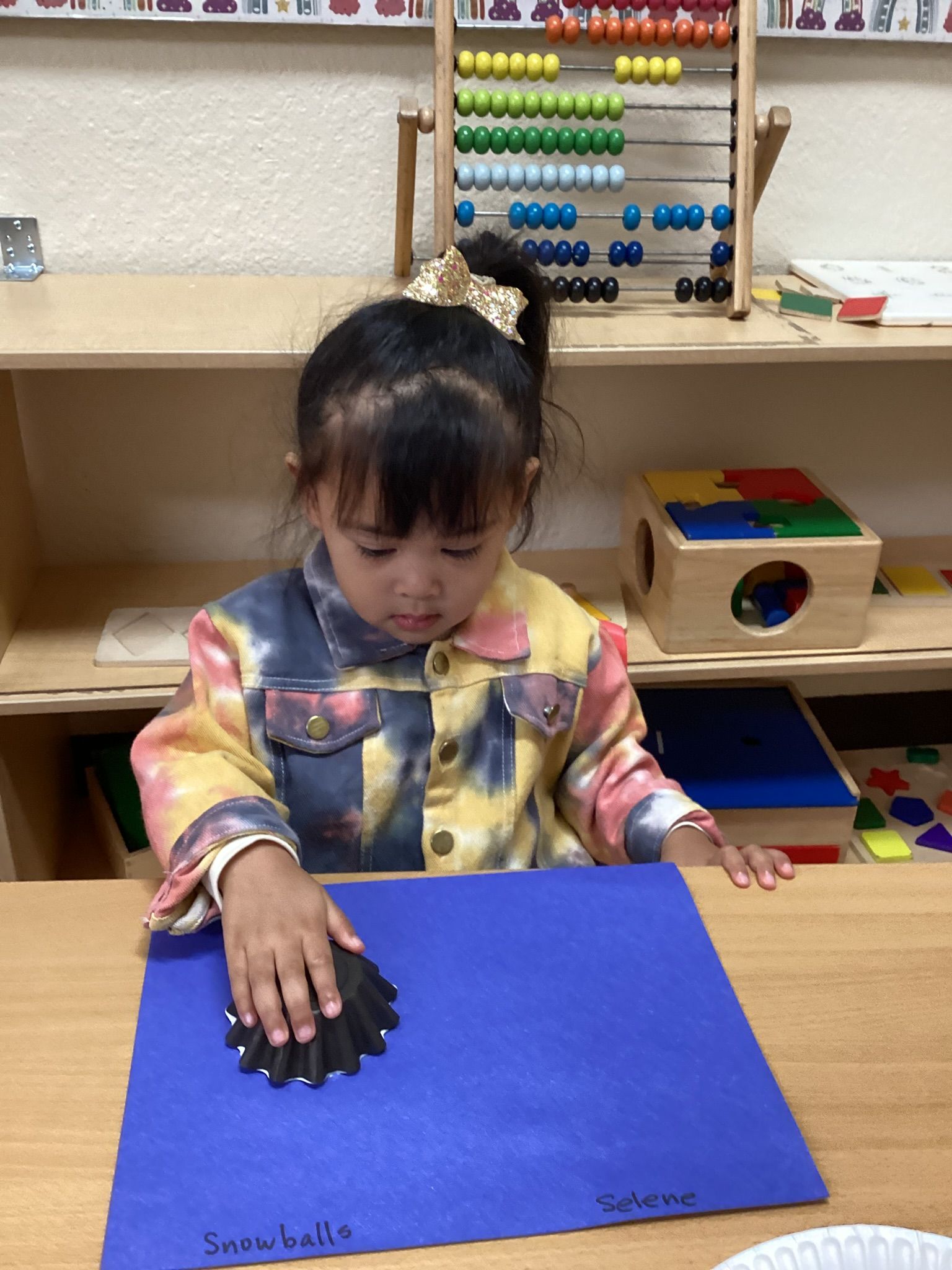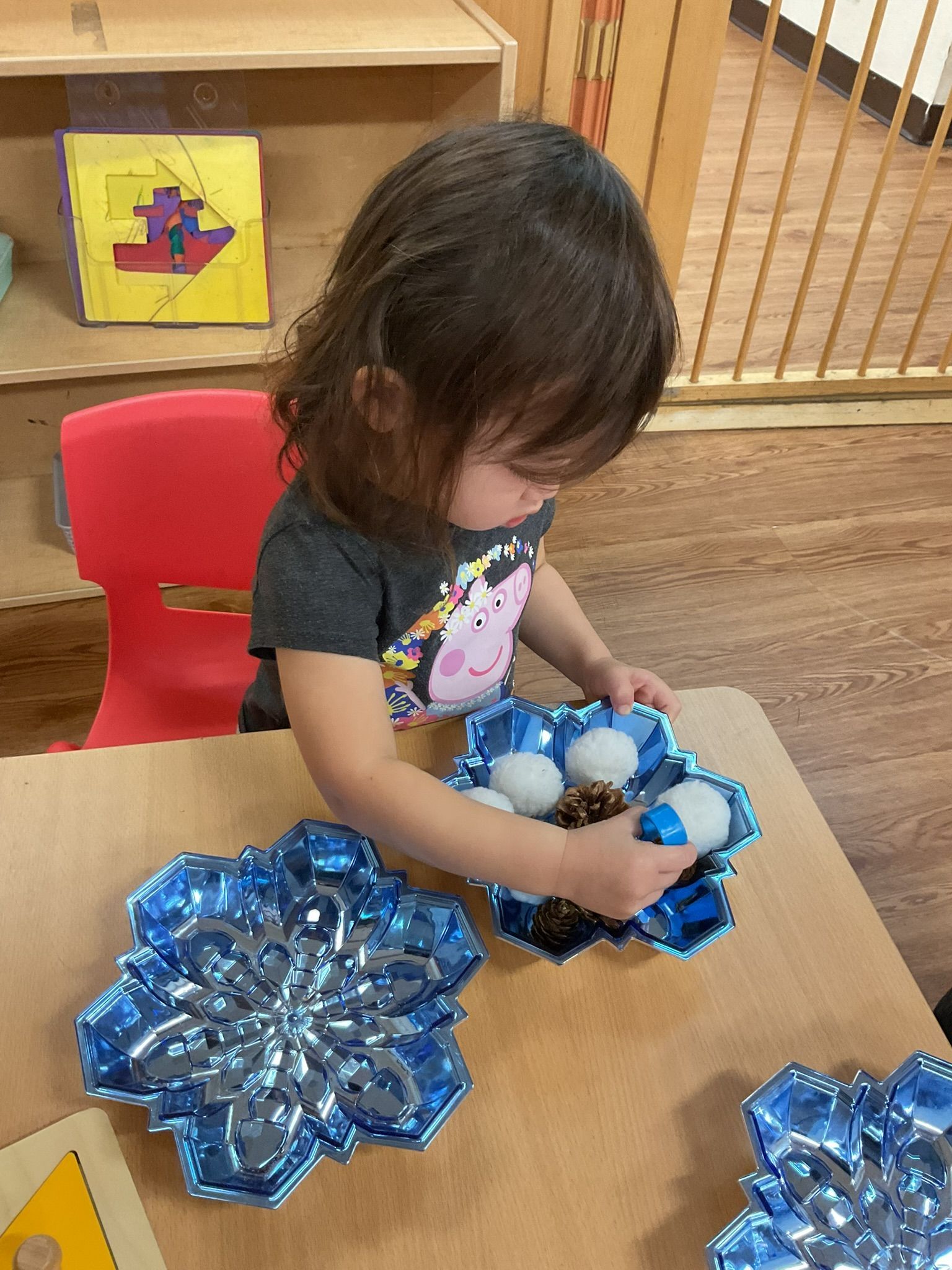 During Enrichment time, the class created delicious healthy treats in cooking like Reindeer celery sticks made of pretzels, celery sticks, sun butter, cranberry raisins. For music, the children enjoyed singing and dancing to some holiday songs which brought lots of energy, happy faces and good vibes. In Art, children painted snowballs and decorating the Christmas tree craft gave them a spirit of Christmas season. In Spanish, the children practiced saying hermano, hermana which means sister and brother. For practical life, they opened and closed a box with lid. For language, they reviewed letters I and J.
