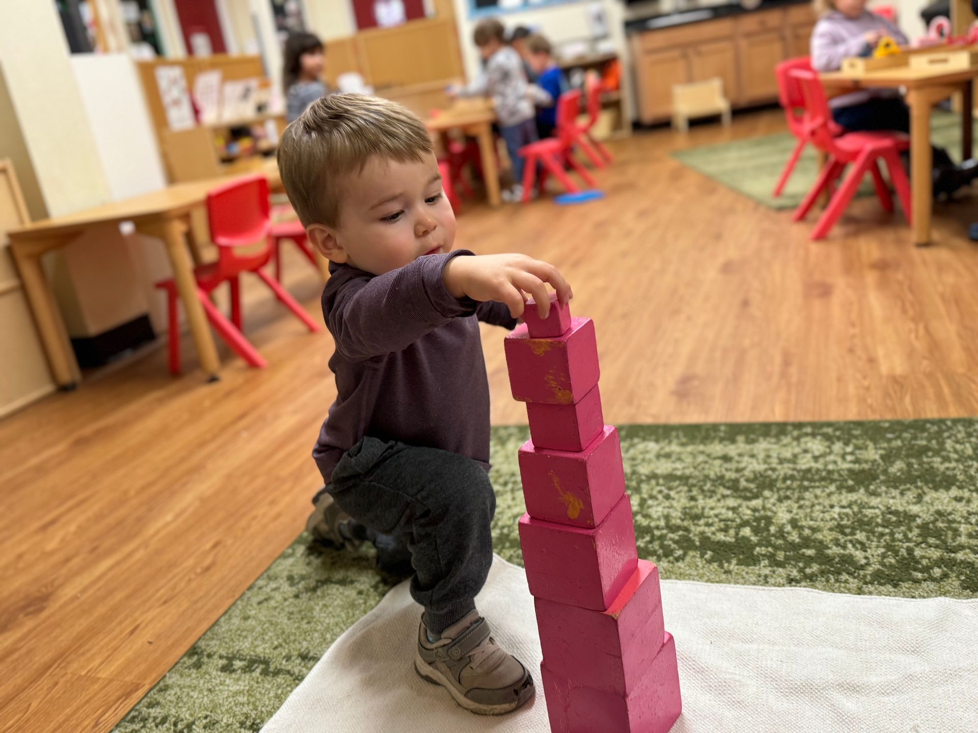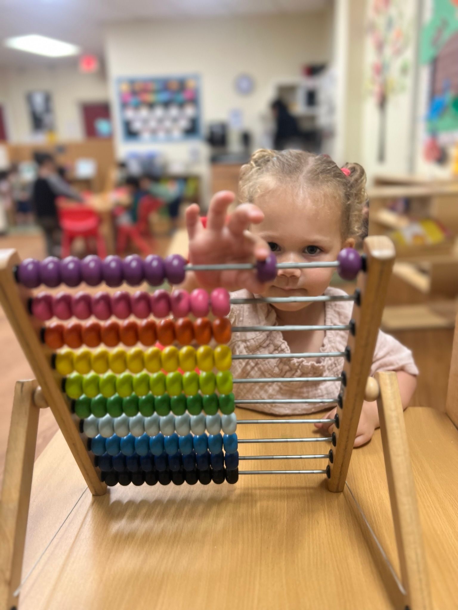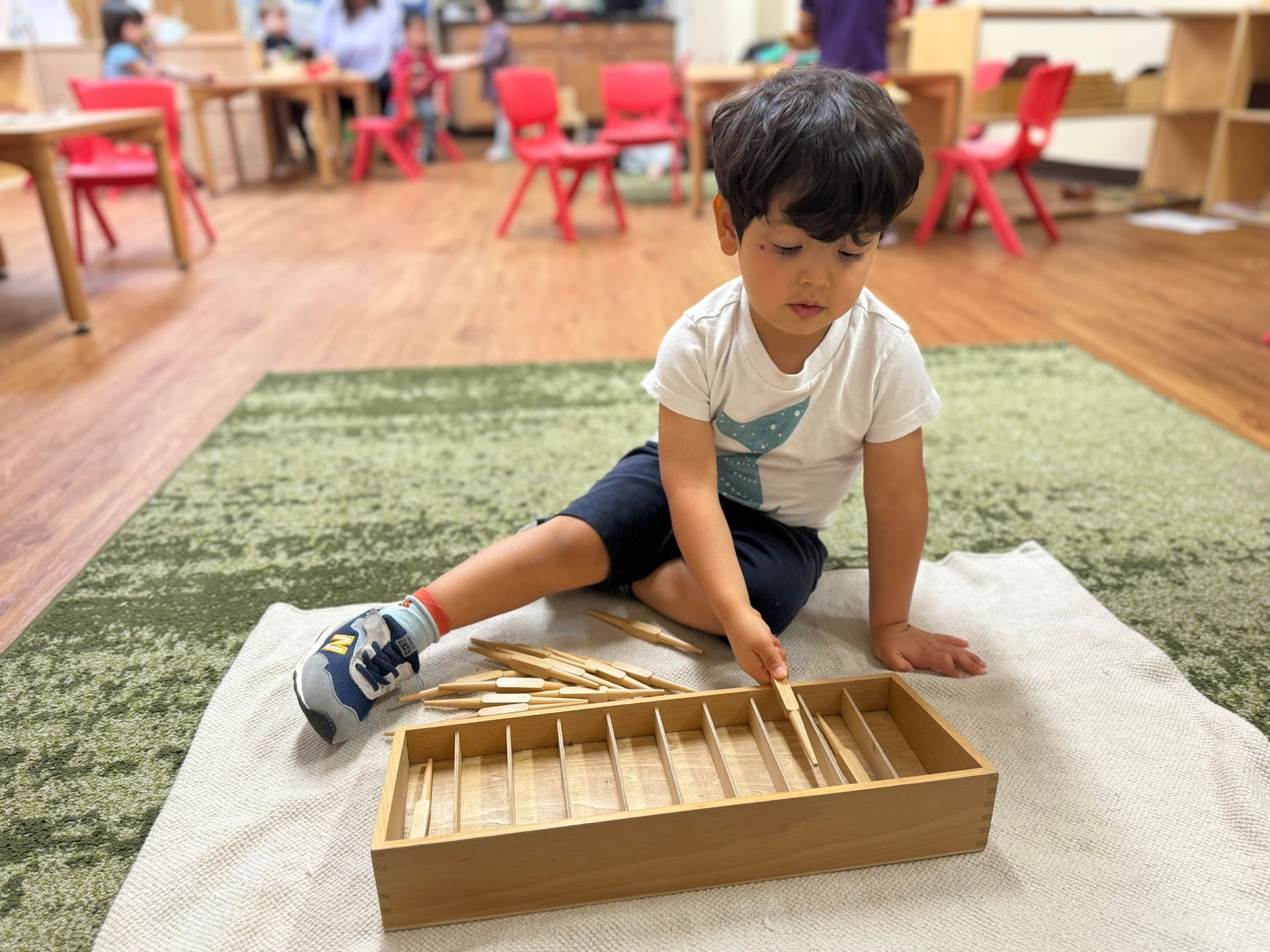 In our Montessori curriculum, we prioritize Practical Life skills by guiding children through various activities using sponges and squeezing. Squeezing a sponge teaches kids to use small muscles in the hands and fingers, which helps improve fine motor skills. The children also practice hand-eye coordination by aiming the water-filled sponge at the target bucket. During the students' circle time, we learn about the songs for the days of the week and the month of the year. Exposing the students to music allows the young brains to soak in the range of notes, tones, and words they will later use, and in doing so, build neural pathways that can influence and enhance cognitive ability for a lifetime.