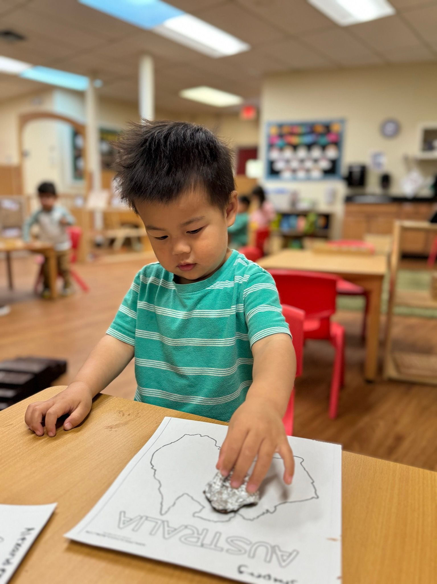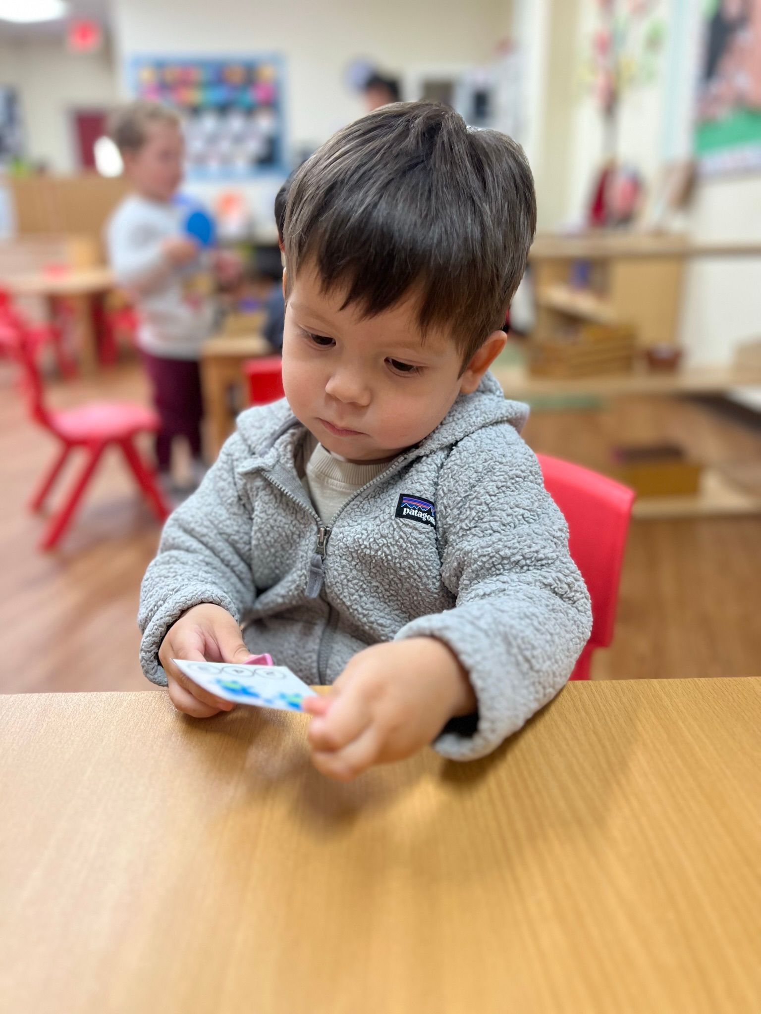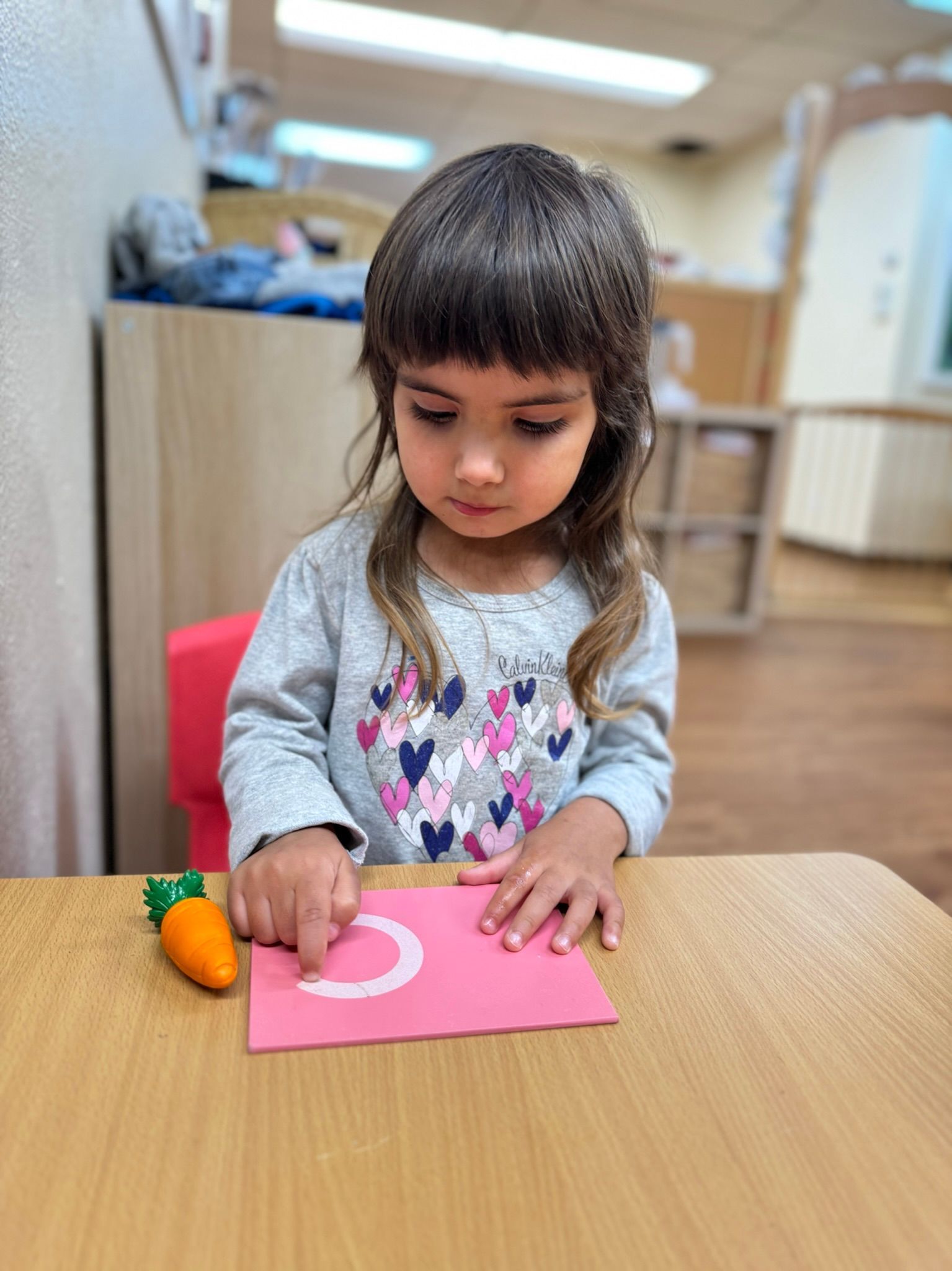 In our Montessori curriculum, we prioritize Practical Life skills by guiding children through various activities using sponges and squeezing. Squeezing a sponge teaches kids to use small muscles in the hands and fingers, which helps improve fine motor skills. The children also practice hand-eye coordination by aiming the water-filled sponge at the target bucket. During the students' circle time, we learn about the songs for the days of the week and the month of the year. Exposing the students to music allows the young brains to soak in the range of notes, tones, and words they will later use, and in doing so, build neural pathways that can influence and enhance cognitive ability for a lifetime.