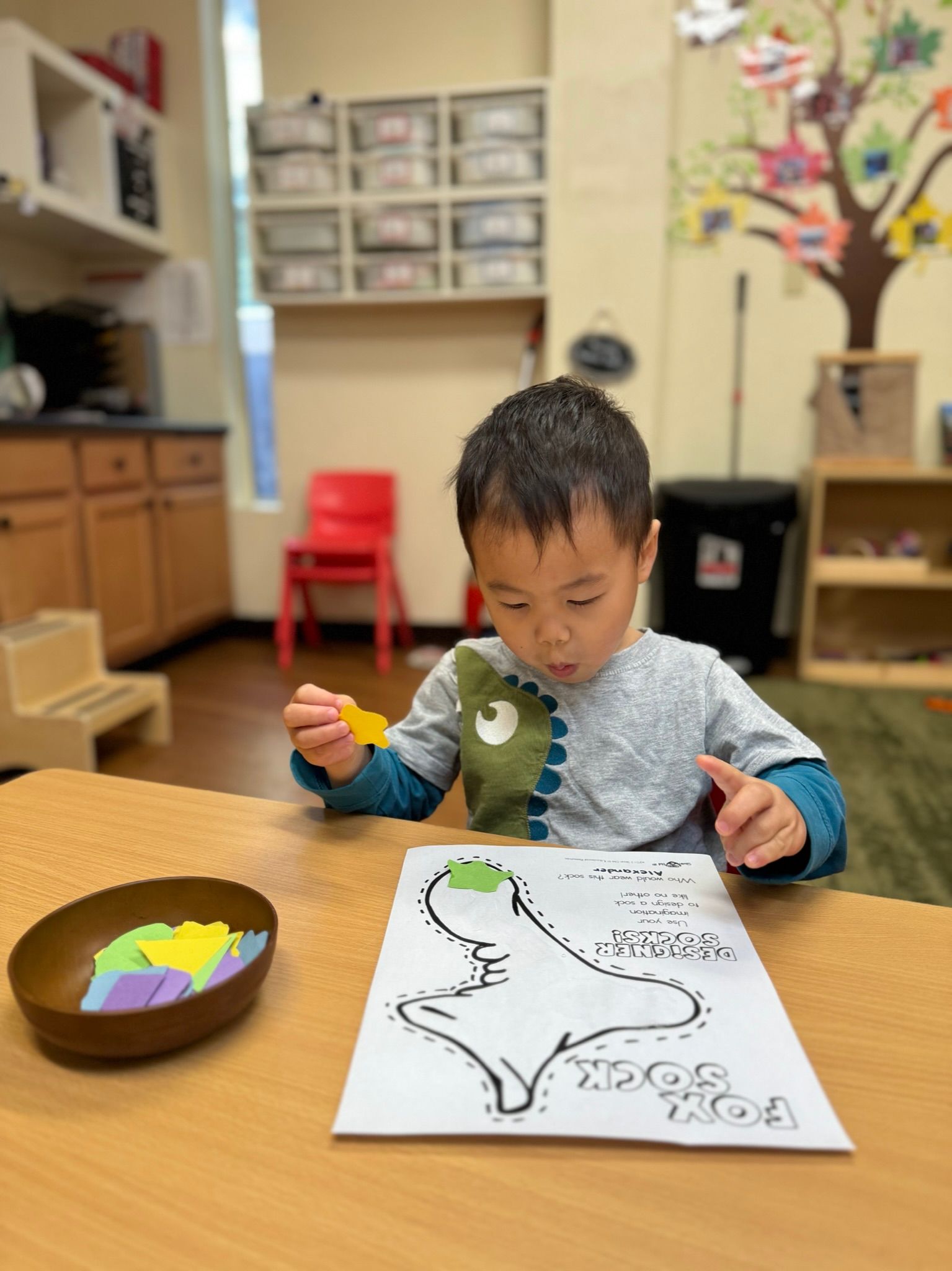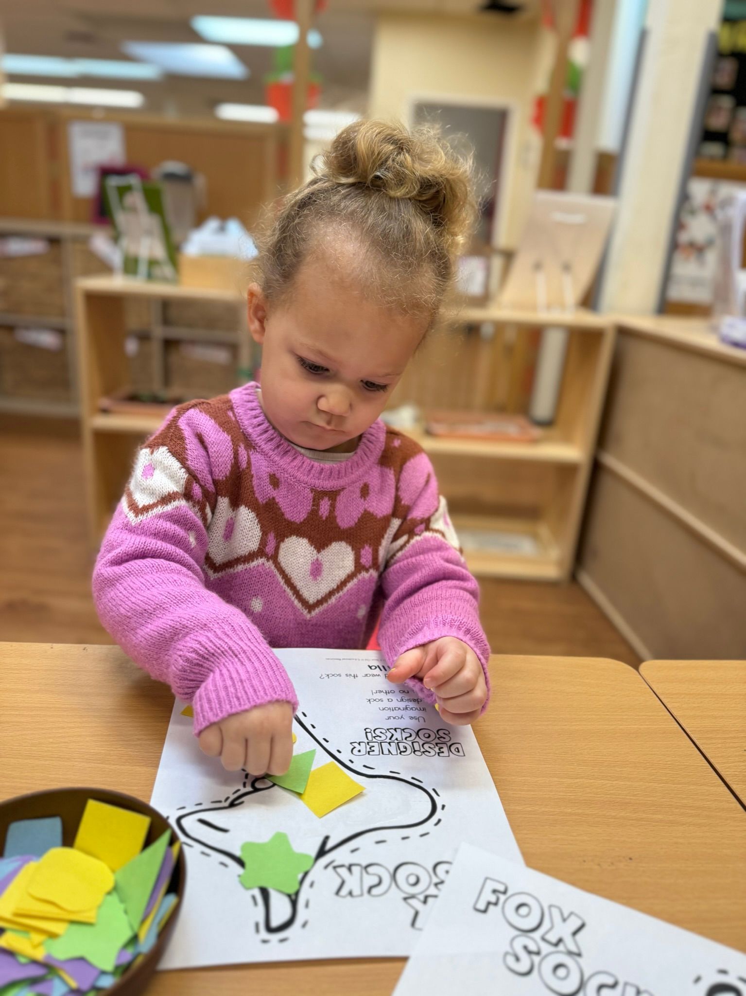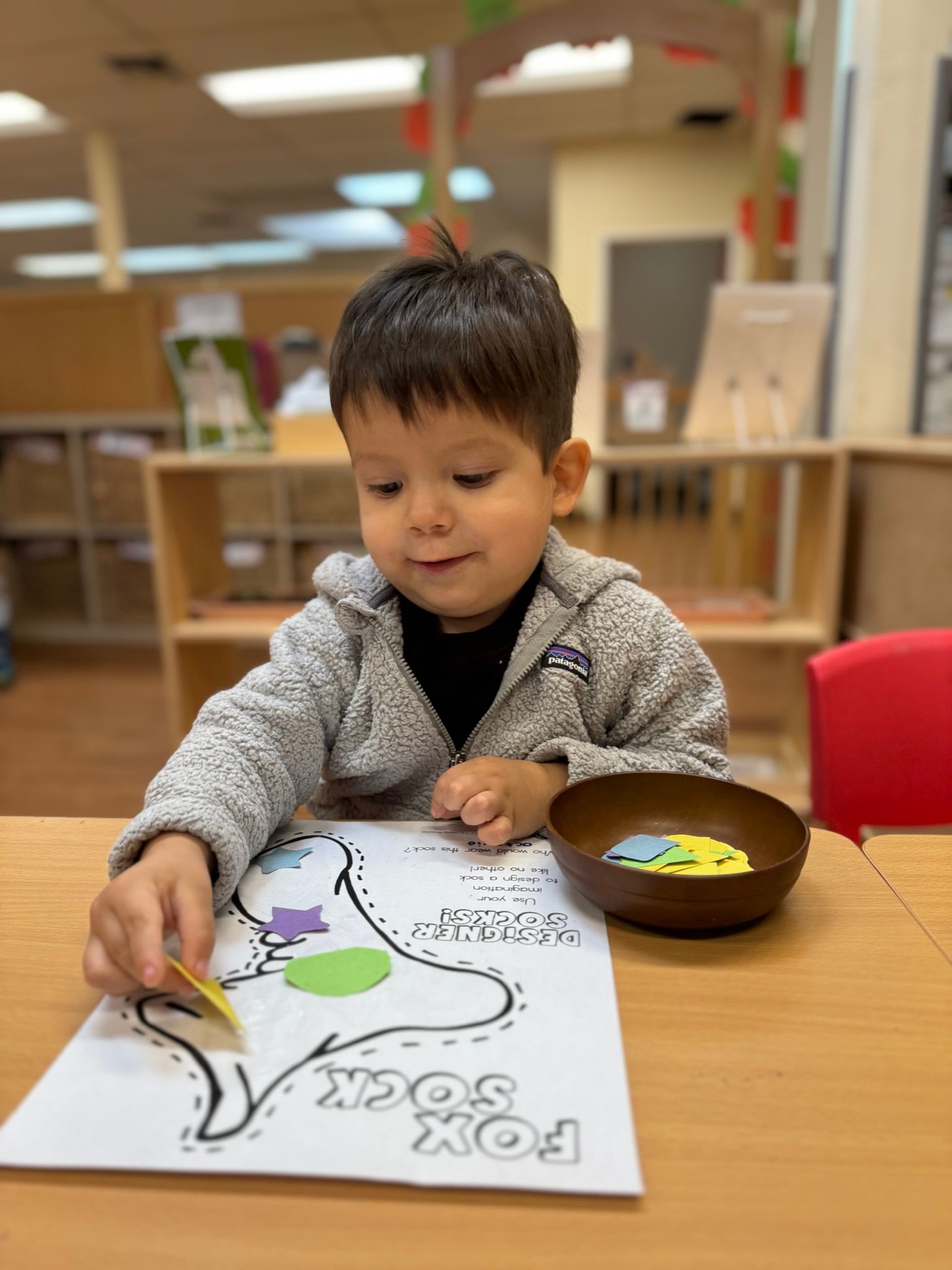 In March, our pre-primary class is engaging in a thematic activity inspired by Dr. Seuss's Fox in Socks, where children design their own socks by attaching various shapes and patterns onto paper, which serves as a valuable educational experience. This initiative fosters creativity and facilitates the development of fine motor skills and hand-eye coordination. By familiarizing themselves with the tactile properties of glue and discerning between different shapes, the children derive joy from the activity and acquire foundational skills essential to their cognitive and physical development.