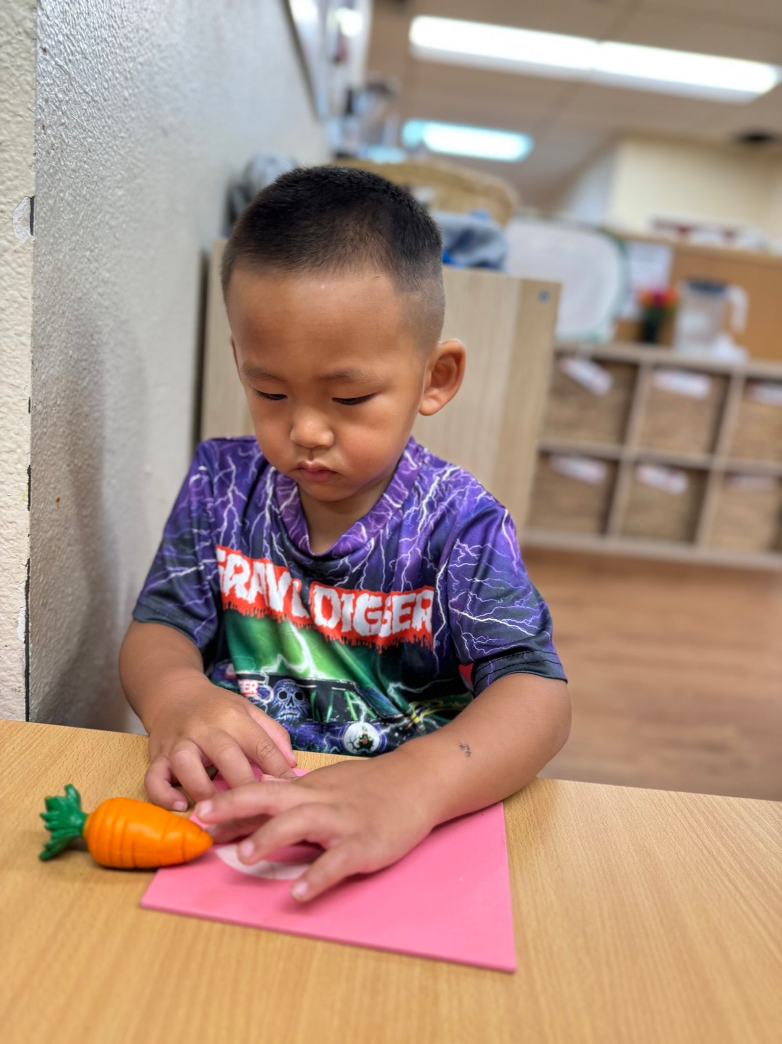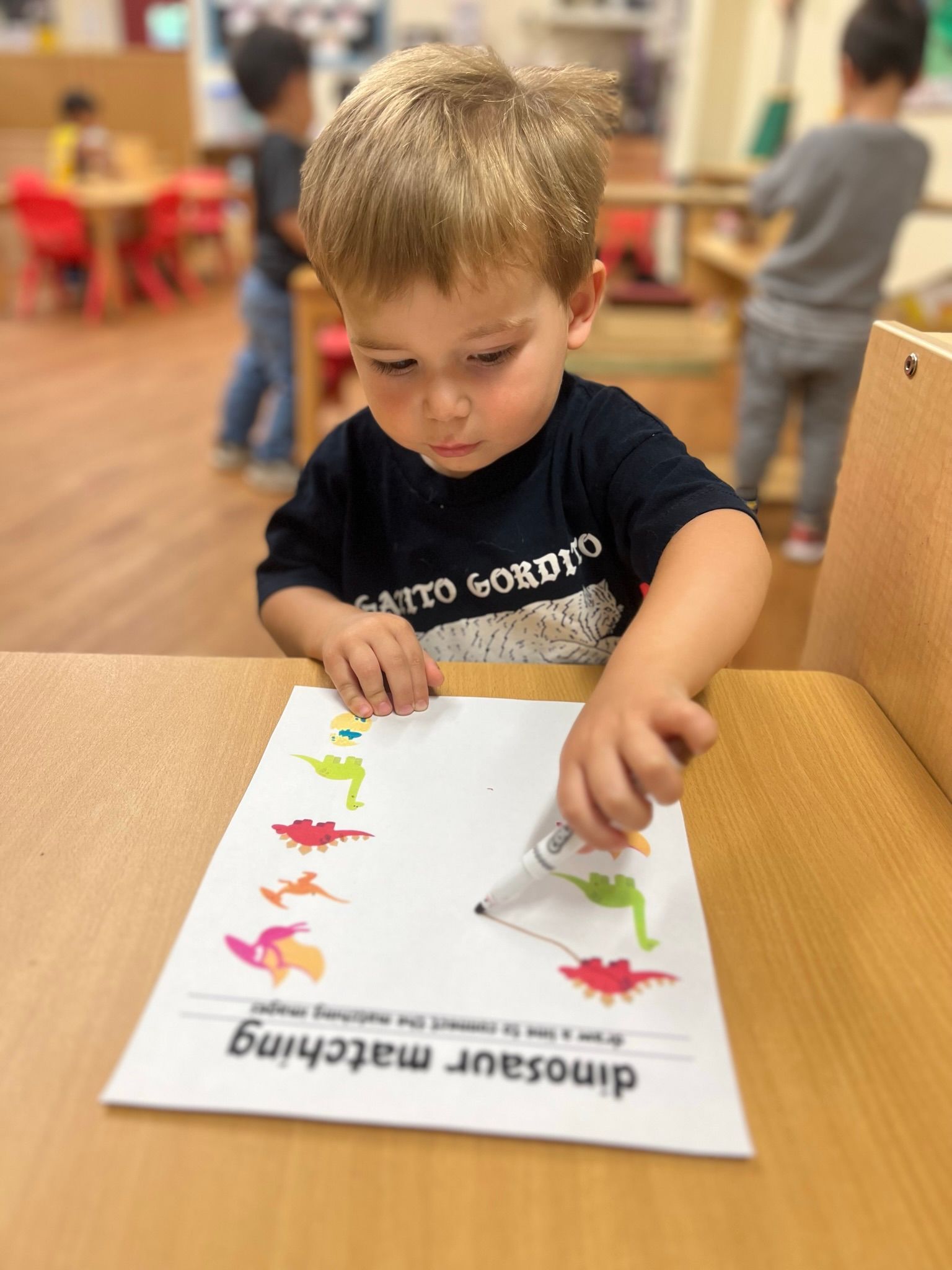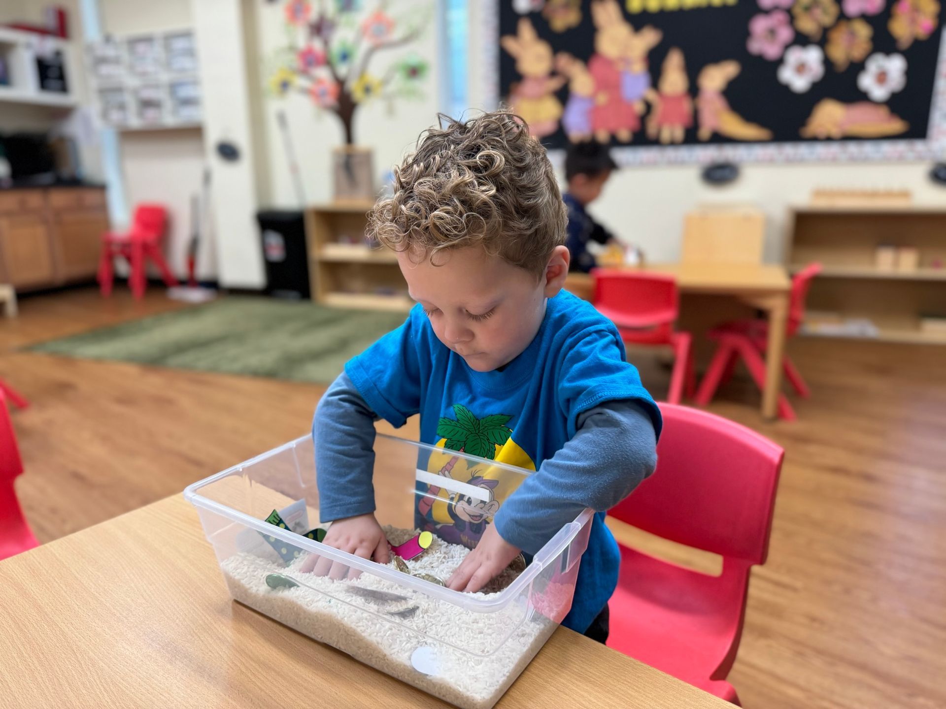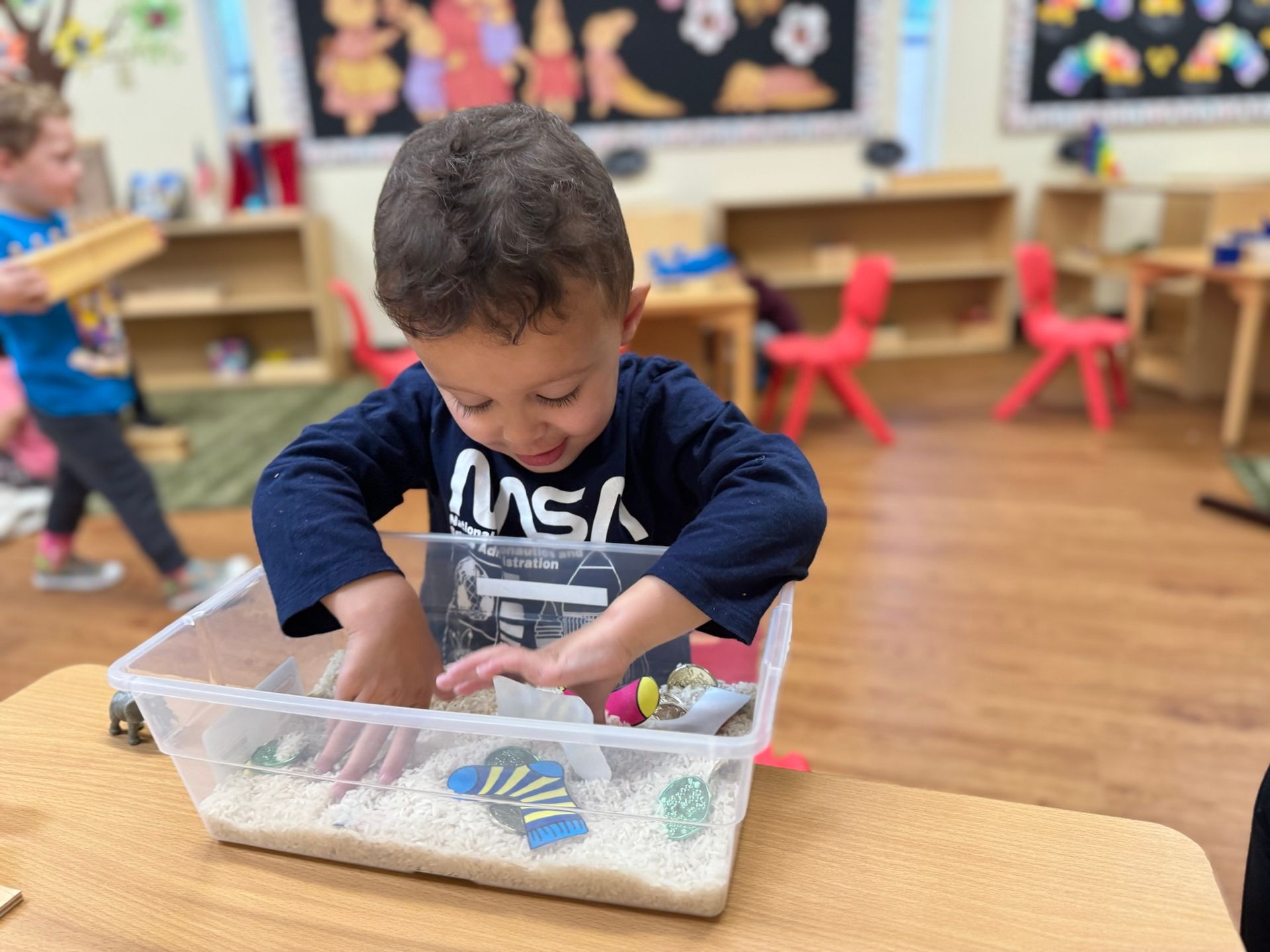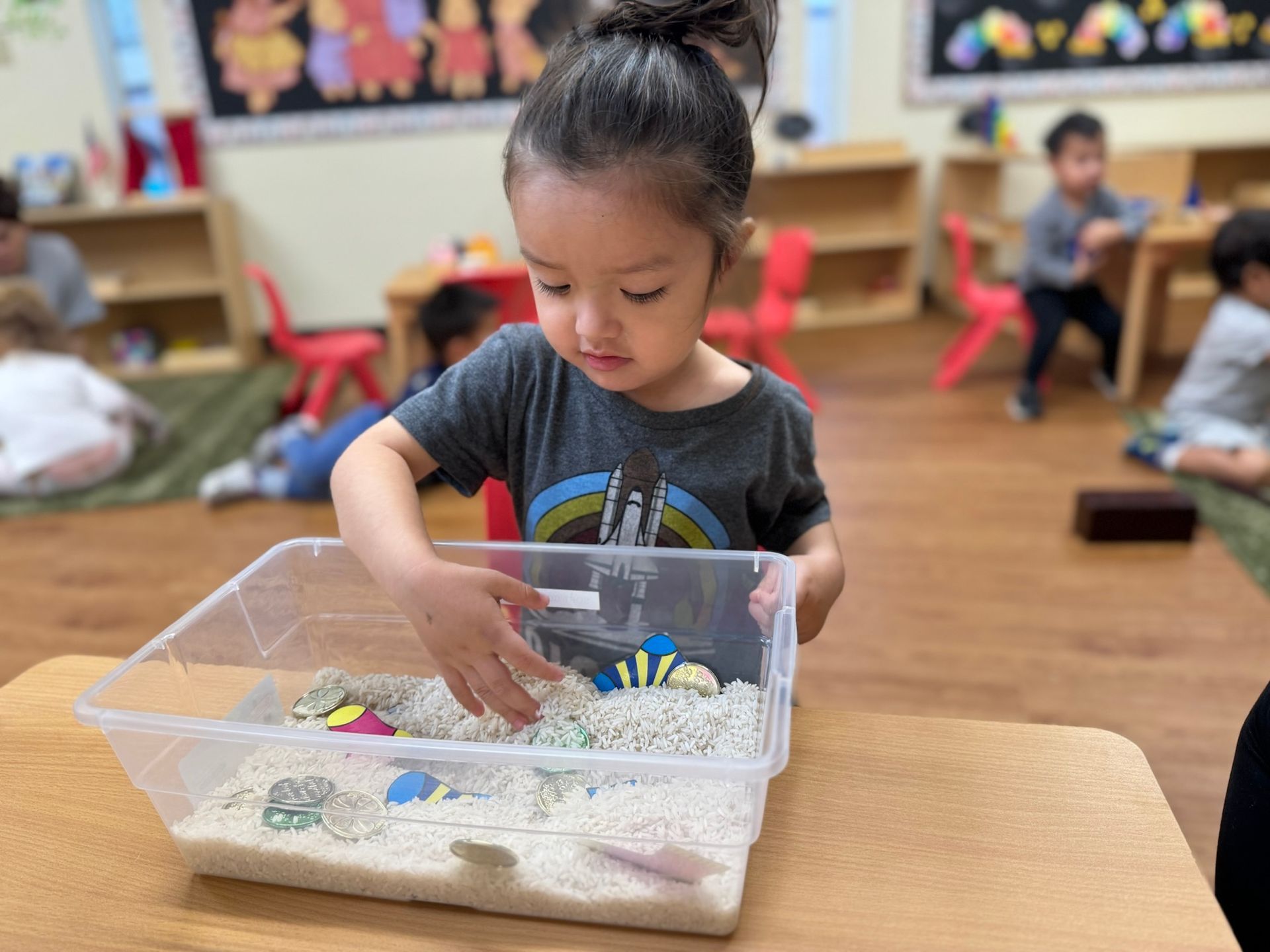 In our Montessori curriculum, we prioritized practical life skills by guiding children through practical life, our students practice sensorial byfinding the fossils to match the dinosaur. Uncover the excitement with our dinosaur fossil activity! This thrilling adventure transports children to a world of dinosaurs and ancient fossils. The activity engages kids in digging, discovering, and learning in a fun and educational manner. As young explorers transform into paleontologists, they dig through a sensory bin filled with rice to find hidden fossils. Using their hands and boundless curiosity, they'll uncover one fossil at a time, sparking a passion for learning and exploration. Our students love the challenge of finding and identifying each fossil. The tactile experience of digging through rice and gently brushing off the fossils adds a hands-on element that enhances their learning and makes every discovery feel like a real archaeological find.