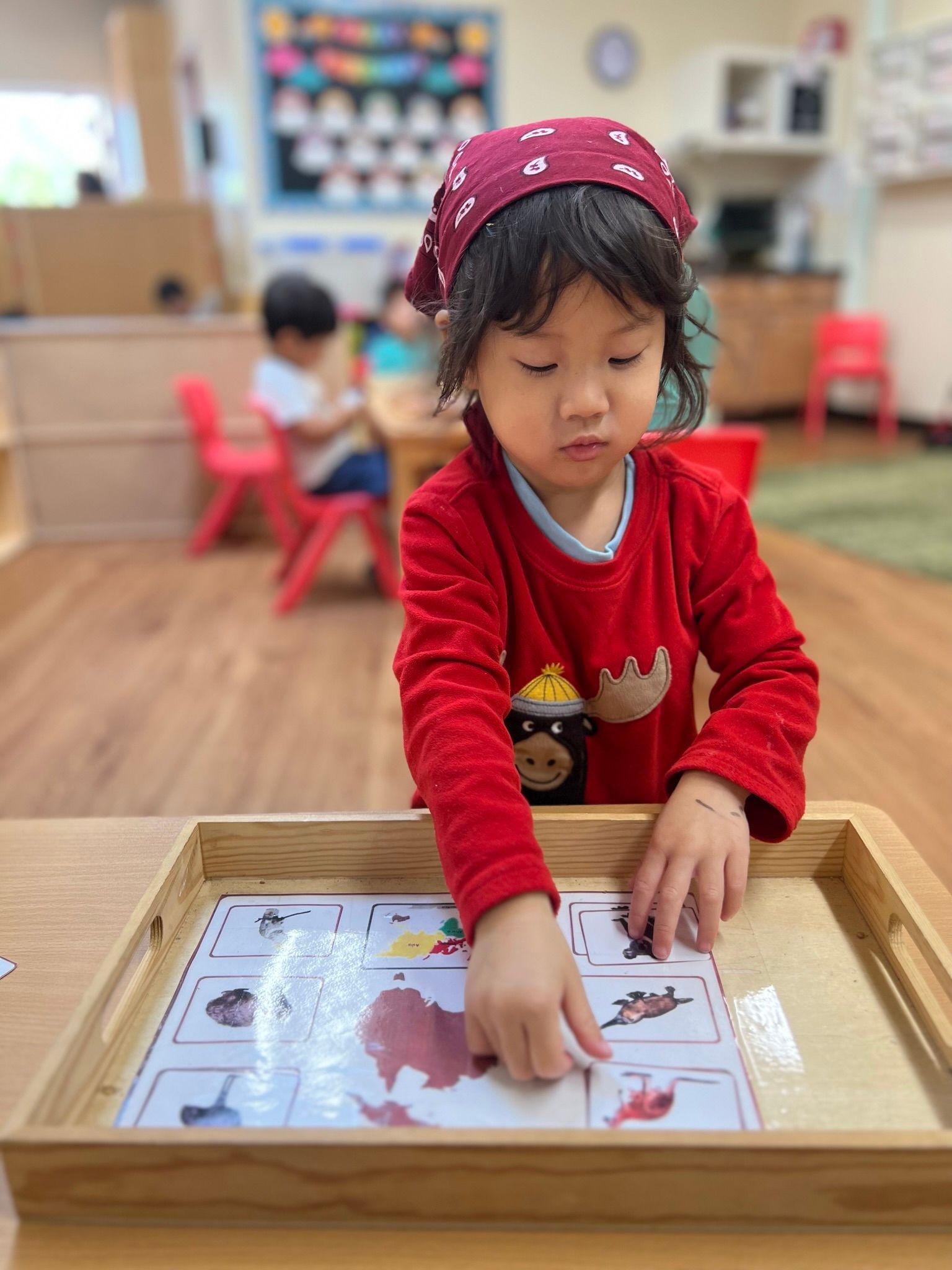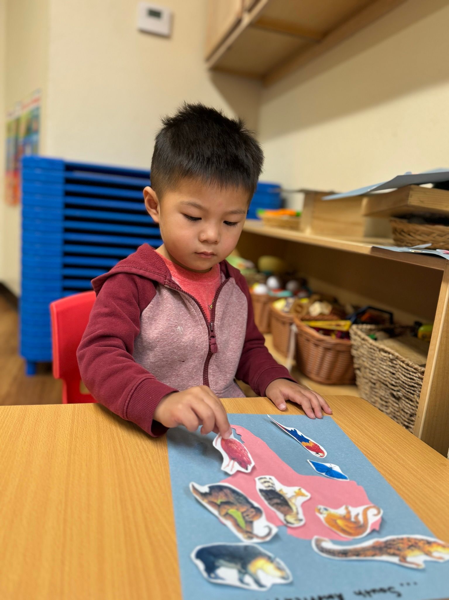 In our Montessori curriculum, we prioritized practical life skills by guiding children through practical life; students engage in tasks such as categorizing eggs by color into corresponding bowls, fostering organizational skills essential for efficient work habits, and maintaining orderly environments. In language studies, exploring letters w, y, and x is facilitated through tactile methodologies, including sandpaper tracing and dot painting. Mathematical aptitude is honed through educational tools such as the spindle box, enabling students to grasp numerical concepts comprehensively from one to ten. Additionally, our science and cultural curriculum delves into the intricate ecosystem of rainforests, focusing on the biodiversity of its animal inhabitants and the critical role rainforests play in sustaining global ecological balance.