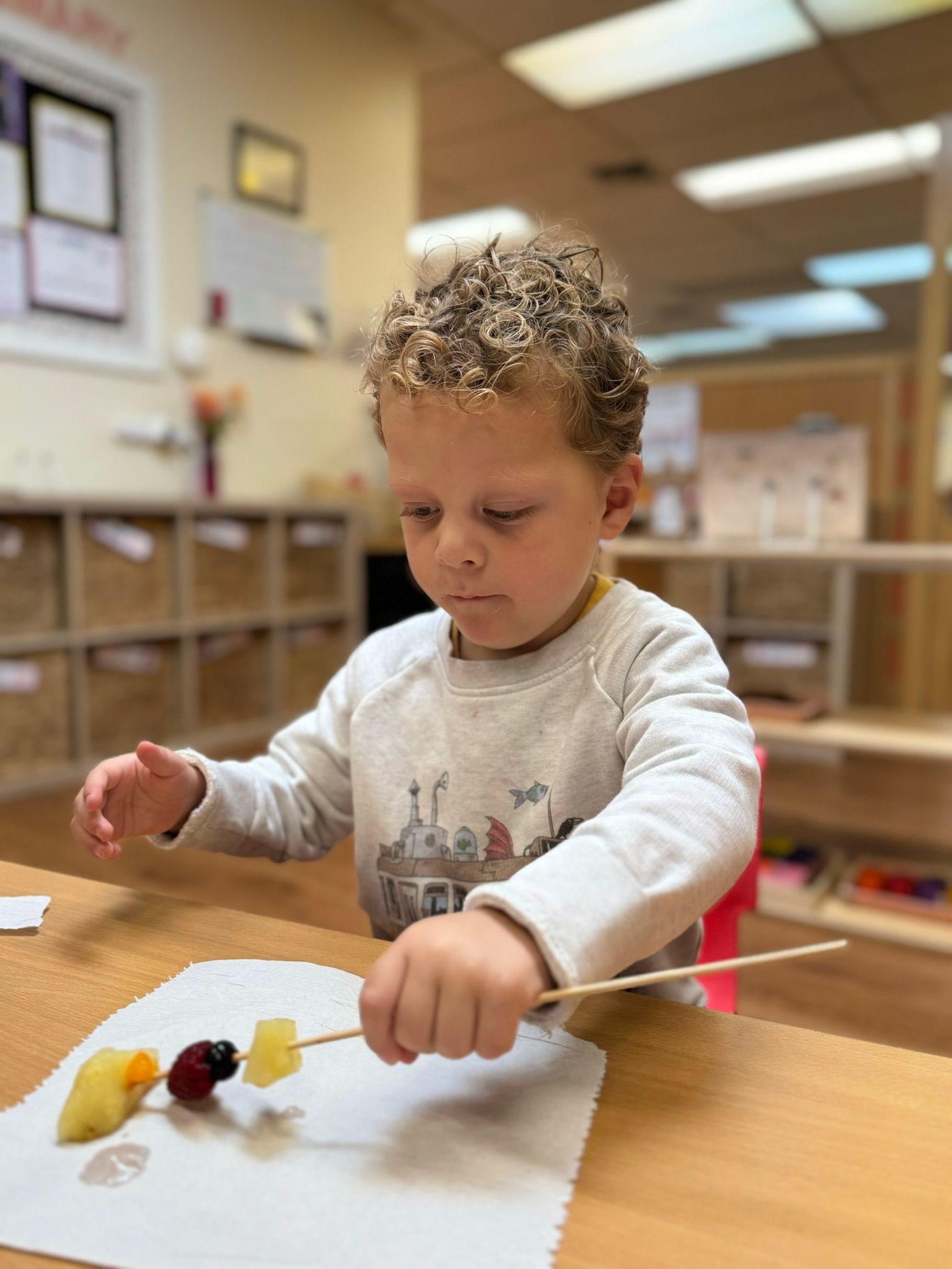 For Enrichments, our class participates in cooking. Exploring cooking can be an adventure, especially when it involves a Chicka Chicka Boom Boom tree1 Recently, the children learned valuable life skills while creating this snack. They started by peeling a banana and placing it on a plate. Then, they arranged six apple slices as tree branches and topped them with blueberries for coconuts. This activity taught them patience, problem-solving, and creativity. Following each step required patience. They had to solve challenges like adjusting ingredients. Their creativity shone as they turned simple items into an edible masterpiece. Plus, it promoted healthy eating habits in a fun way. Cooking isn't just about recipes; it's about learning skills for life.