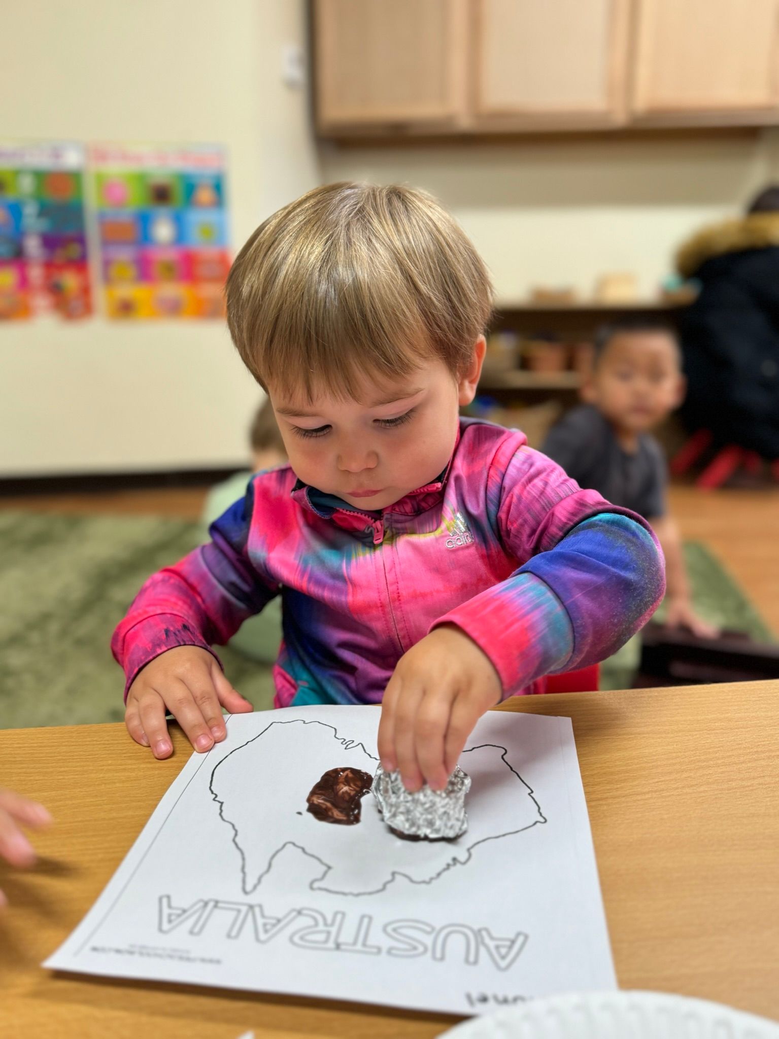 As for Montessori learning, we did many practical life skill jobs: spooning apples and using tongs to transfer pompoms. We focused on the letters a - d for Language, introducing sand letters. For sensorial: the children learned how to do the knobbed cylinder blocks ( shortest to tallest and width to thin ). For Math, we counted apples up to ten; for science, we focused on learning about the life cycle and parts of an apple; and for geography, the children learned about the seven continents. They repeatedly sang the song “Tell Me the Continents” to help them remember the names of the continents, which they enjoy singing.